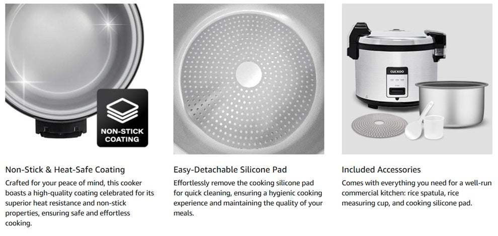 Le cuiseur à riz commercial CUCKOO CR-3032 de 30 tasses (non cuites) et son mode maintien au chaud sont des appareils performants conçus pour la cuisine à grande échelle, idéaux pour les restaurants, les traiteurs ou les grandes familles. Avec une capacité généreuse de 30 tasses de riz cru (produisant jusqu'à 60 tasses de riz cuit), ce cuiseur à riz garantit que vous avez suffisamment de riz à servir lors des repas chargés.